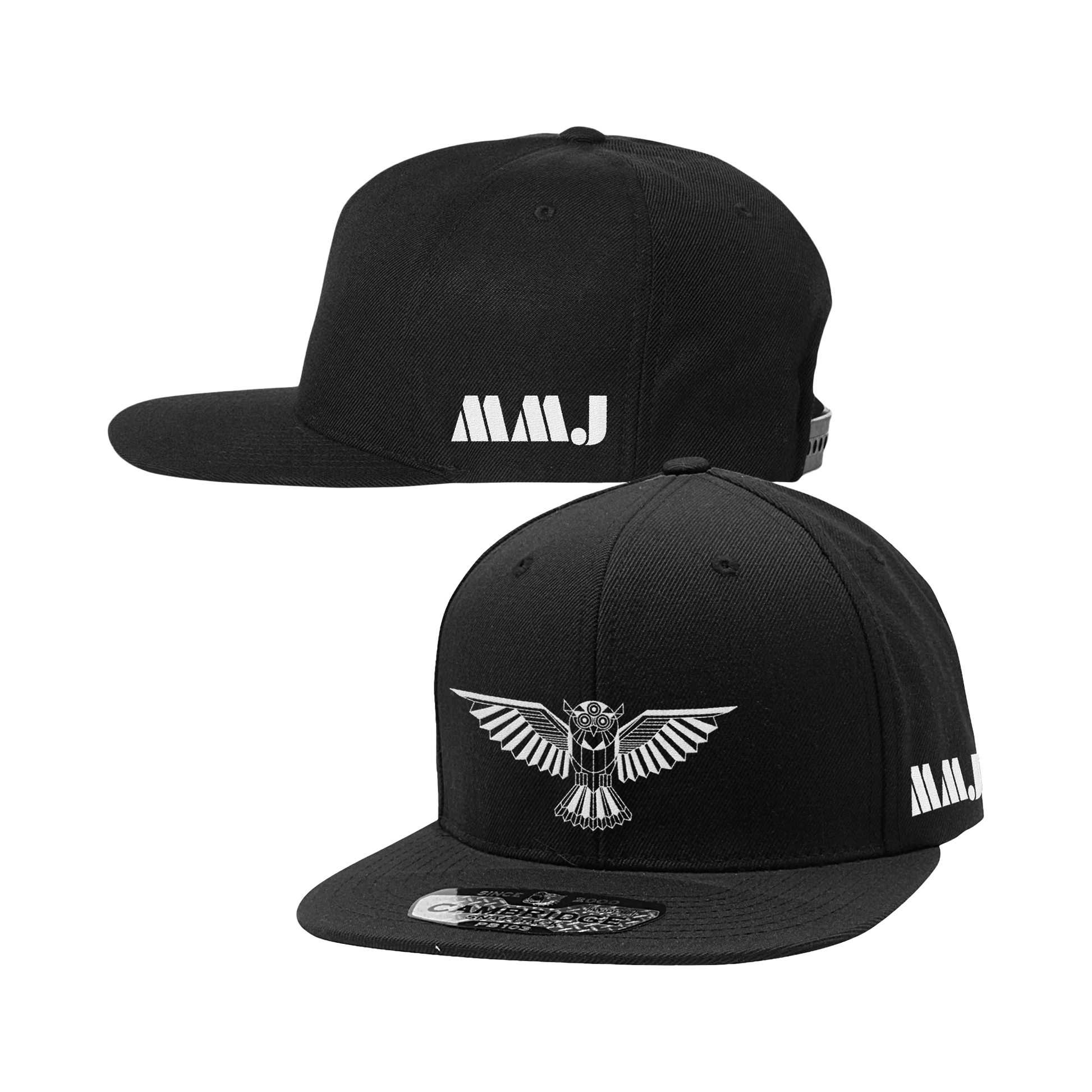 Emboidered owl design by Nate Duval on front of high profile wool trucker hat with MMJ embroidered on the side.